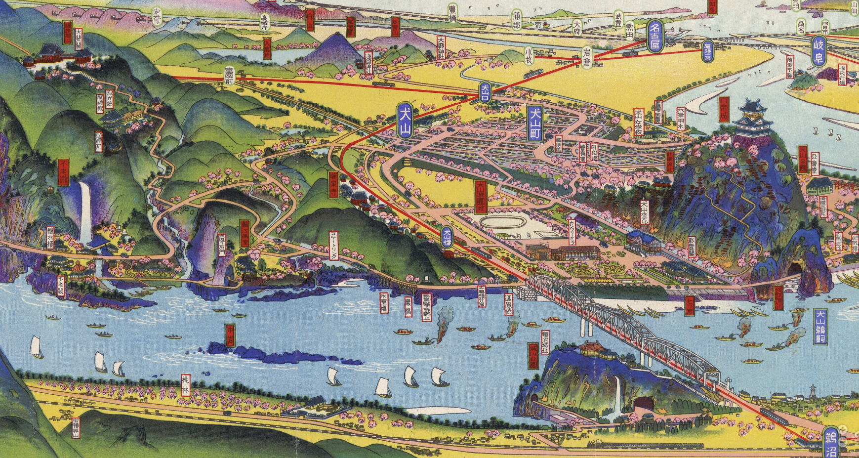 それで先日子供の頃に住んでいた犬山の城下町エリアをとある人に案内していただいたというか、久々にあの辺りを散策したんですけれども、たぶんあのあたりをじっくり歩いたのは15年ぶりとかそれ以上ですかね。まその時にいろいろ話をしまして、犬山に栗栖という地域があるんですけど、愛知県の一番北の端っこで、木曽川の向こうが岐阜県で、手前側がクリスっていうエリアなんですけど、まーここはかなり山奥というか、過疎地域で、小学校があって、自分が中学校に入った時に、そのエリアの小学校の人たちが同じ中学校になるんですけれども、そのクリスの小学校は、ま一学年に一人か二人しかいないんですね。 で、確か自分が中学の時に学年に2人いたんですけれども、2人ともま文武両道という感じで頭が良くて優しかったので結構好きだったんですね。まあクラスが別になったりとかで気づいたら疎遠になってましたが、確か一人は地元の国立の医学部に入りました。それで本題に戻ると、そこに桃太郎神社っていうものがありまして、で、これは愛知県でもよく知られたB級スポット的な場所で、 概要については調べてもらったらすぐわかると思うので、是非写真とかで見て欲しいんですけど。まB級といったのは、ここに浅野正雲という彫刻家による作品がパラパラとありまして、で、それがま桃太郎とか、キジとかサルとか、そういった登場人物たちがいるんですけど、これも子供ながらに、微妙に不気味というか、トラウマになりそうな造形をしていまして、で、例えば犬山には岡本太郎の若い太陽の塔っていう作品があって、で、これが、まモンキーパークにあるんですけど、まなんか山の上にありまして、 子供の頃よく、 車の中で遠くから山の上に、この若い太陽の塔が見えてたんですけど、これが本当にトラウマになりそうだというか、見るたびに不思議な気持ちになっていたんですけど、まあ地元なので結構犬山にはそういった不思議な思い出のある場所がありまして、桃太郎神社というか桃太郎伝説と栗栖エリアもそのうちの一つですね。 で、それで気になったのでいろいろ調べたんですけど、桃太郎神社が今の場所にできたのが昭和五年ですね。 で、その時に尽力していたのが、あの吉田初三郎らしいんですね。 で、彼は実はしばらく犬山に工房を構えて住んでいた時期もあったみたいで、この地方の桃太郎伝説を発掘して、日本一桃太郎会というものを自ら結成して会長を務めていたっていうようなことを知ったんですけれども、 ここがすごく面白くて、しかも吉田初三郎が犬山の鳥瞰図とか、名所図絵みたいなものも多く書いていて、それらもとても魅力的なんですね。 このあたりの情報については、犬山日本一桃太郎会っていうアカウントが、最近noteで、これに関する記事をいろいろと書いているみたいなので、興味のある人はぜひ見てみてください。 どうやら初三郎は、犬山を観光地化を推し進めた立役者ともいえるような人物だったようですね。